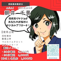| 四柱推命鑑定士 朝井千景 | - | 占い(四柱推命、数理占学、タロット) | https://www.instagram.com /asaichikage ![]()  |